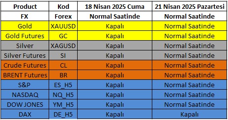 Paskalya tatili (Good Friday) sebebiyle 18 Nisan Cuma ve 21 Nisan Pazartesi 2025 tarihlerinde aşağıdaki tabloda görüldüğü üzere bazı ürünlerin işlem saatleri değişiklik gösterecektir. Tatil süresince değerli metaller ile vadeli kontatlar kapalıyyen, açık olan ürünlerde (Spot paralar) likidite koşullarının sığ ve buna bağlı olarak da olağan dışı volatilite ile spread açılması riski bulunmaktadır. Bu durum hesapların Stop Out seviyesinin altında işlemlerin kapanmasına neden olabileceği gibi, piyasa açılışlarında veya gün içinde boşluklu (Gap) hareketlere neden olabilir. Tatil dönemlerinde işlem yapmak ve tatil içerisinde yaşanabilecek gelişmelerin piyasa açılışına yansıması sert olacağından pozisyon taşımak da riskli olabilir. Açık olan ürünlerde fiyat sağlayıcıları fiyat vermeyi erken keserlerse, piyasa kapanmadan önce platformda işlem yapılması durabilir. Ayrıca tatil süresince bankalar kapalı olacağından Swfit işlemleri gecikebilir ya da hiç gerçekleşmeyebilir. Bu nedenle teminat işlemlerinizi tatil öncesinde ayarlamanızı önemli hatırlatırız.